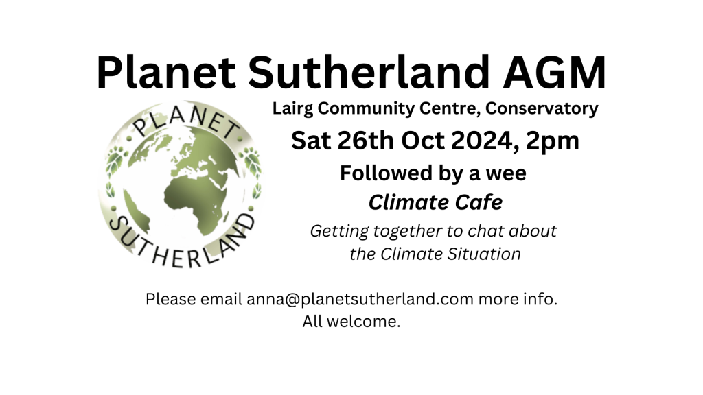 Our short AGM will be followed by a Climate Cafe – discussing thoughts, concerns and plans for the coming year. No doubt these will include chats about food, growing, cooking, meetings, composting, food waste, energy and getting regular cafes going.https://planetsutherland.com/climate-environment-events/
